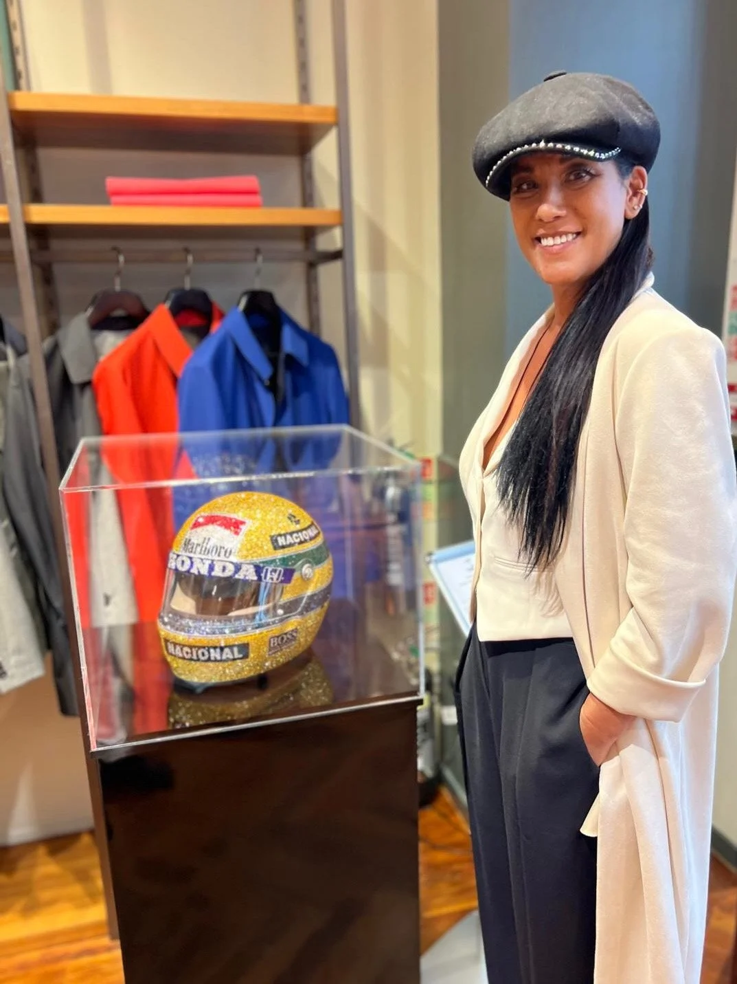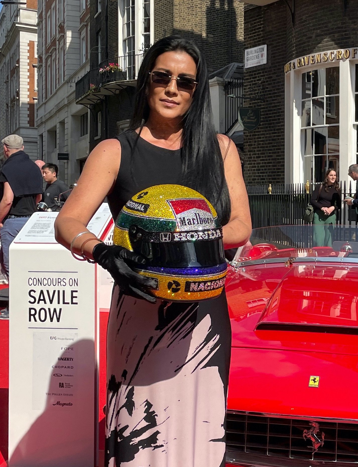STOKESI with the Ayrton Senna Suzuka 88 helmet on display at Scabal Tailors during Savile Row concours 2024